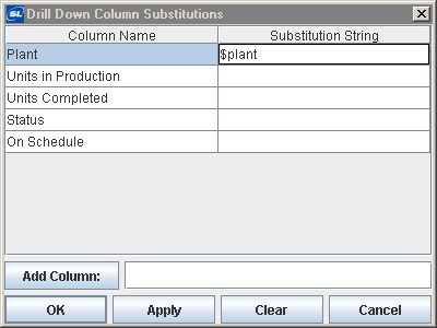 In many objects that display tabular data, it is possible to specify which column values will be passed as substitutions into drill down displays. In the Object Properties window, double-click on drillDownColumnSubs in the Property Name field to bring up the Drill Down Column Substitutions dialog.