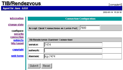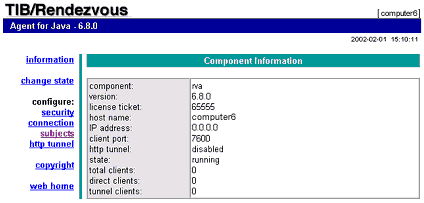 connection. Configuring the TIBCO Rendezvous Agent Process To configure the TIBCO Rendezvous Agent Process (rva) for your daemon connection: 1. Open a browser to the rva http interface address. If you do not know the rva http interface, the default is http://host:7680/ where host is the name of your machine. If this does not work, contact your TIBCO Hawk system administrator. Your setup may be running with a different http interface or you may not have permission to change the rva settings. The browser interface should look similar to the following: