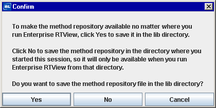 The format of the method repository file must correspond to the Store Method List Mode. The Display Builder must be started with the selected method list mode enabled in order for you to save a method repository file that is formatted correctly. When you save a new Store Method List Mode, you must restart Enterprise RTView (in order for the change to take effect) and then save a method repository file. NOTE: Enterprise RTView will output an error message in your command window to alert you that the current method repository file does not correspond to the selected method list mode. If you continue to use Enterprise RTView with a method repository file that is incorrectly formatted, no method descriptions from that file will be used. When you click Save Method Repository,
