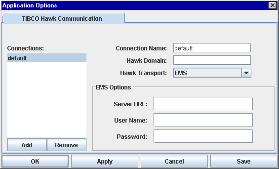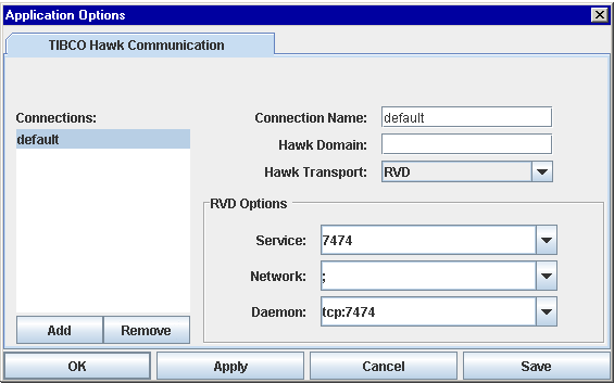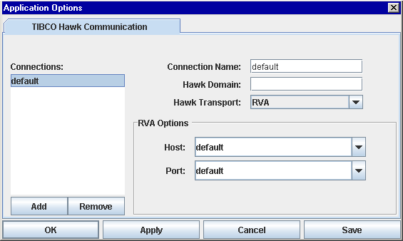 If you are using only one connection, select default in the Connection list, edit it and click Add. If you are using more than one connection, type in the configurations including a unique connection name, then click Add. The new connection appears in the Conection list. To edit a connection, select it in the Connection list, edit it and click Add. To remove a connection, select it in the Connection list and click Remove, Apply, OK, Save applies all changes. Cancel effects all the recently made connections. If Enterprise RTView is unable to make a connection, an error message will appear on the console when you click Apply. A unique name must be specified for each connection. This name is used to create an Agent Group by the same name containing all agents on that connection. A default connection is automatically created that can be modified but not removed. By default, TIBCO Hawk uses rvd. Different configurations apply to rva and EMS, as described below. NOTE: Connections should have unique parameters or some agents may not be added to the appropriate group. See Communicating with TIBCO Hawk for a detailed explanation of rva and rvd. TIBCO Hawk Communication Settings