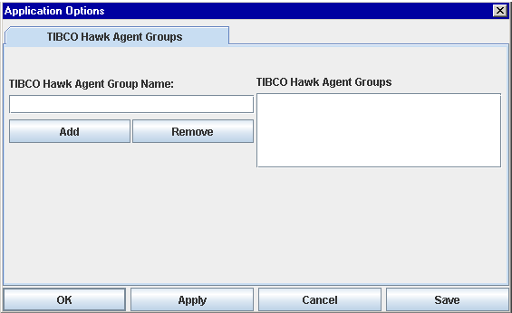 TIBCO Hawk Agent Group Name - Enter a name for the Agent Group. Add - Click the Add button to insert the Agent Group into the listing. NOTE: You must click Save in order for Agent Groups you've added to be listed the next time you run Enterprise RTView. Remove - Select an Agent Group from the list and click the Remove button to delete. NOTE: It is not possible to permanently remove Agent Groups that are automatically created for TIBCO Hawk clusters. Define TIBCO Hawk Agent Groups