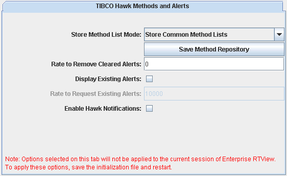 NOTE: Options selected on the TIBCO Hawk Methods and Alerts tab are not applied to the current session of Enterprise RTView. Click the Save button to record all TIBCO Hawk application options to the initialization file HAWKOPTIONS.ini and restart Enterprise RTView to apply these changes.