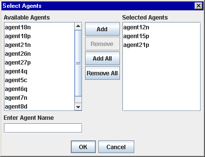 To add an agent, select an item from the Available Agents list and click on the Add button. If the agent you require is not listed, type your selection into the Enter Agent Name field. NOTE: For agents that are not on the default connection, specify the connection in parentheses after the agent name. For example, to specify Agent1 on Connection1, use Agent1(Connection1). Click the Remove button to delete an item previously added to the Selected Agent list. NOTE: It